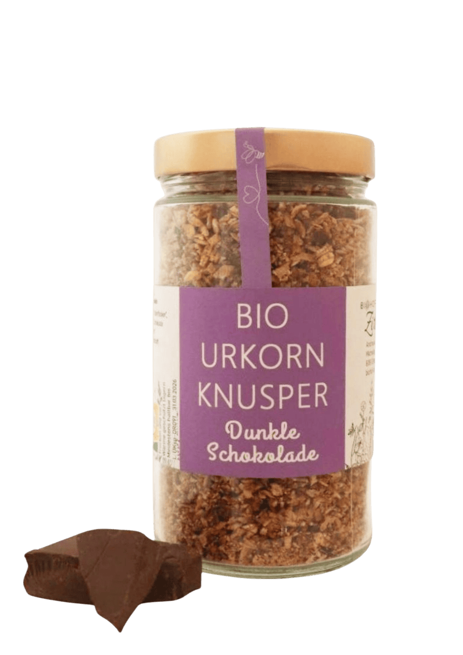 Unser Bio UrKornKnuspermüsli Dunkle Schokolade verbindet die ursprüngliche Kraft von Dinkel und Hafer mit edlen Stückchen dunkler Schokolade zu einem intensiven Geschmackserlebnis. Mit unserem Honig leicht gesüßt entsteht eine feine Knuspermischung mit vollmundiger Kakaonote.
